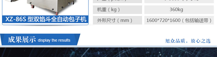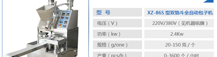 XZ-86S型雙餡斗全自動(dòng)包子機(jī),可生產(chǎn)各種肉包、肉菜包、菜包、小籠包、湯包、水晶包、圓饅頭、奶黃包、豆沙包、叉燒包、南瓜餅等幾十種包餡制品。適用于賓館、飯店、學(xué)校、機(jī)關(guān)企業(yè)食堂、饅頭或包子加工廠、早餐工程店及速凍食品廠等單位??蓾M足不同客戶群體。免費(fèi)提供工藝技術(shù)。免費(fèi)上門(mén)培訓(xùn)指導(dǎo)安裝。