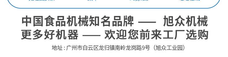 廣州旭眾食品機(jī)械有限公司是一家集科研開發(fā),生產(chǎn)設(shè)計(jì),營銷服務(wù)為一體的現(xiàn)代化生產(chǎn)企業(yè)?,F(xiàn)代化生產(chǎn)車間,精湛制造技術(shù),所產(chǎn)機(jī)械歷經(jīng)市場(chǎng)重重考驗(yàn),不斷贏得海內(nèi)外客戶的贊譽(yù)。