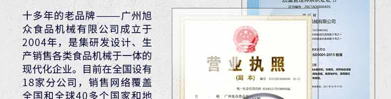 廣州旭眾食品機械有限公司是一家集科研開發(fā),生產(chǎn)設計,營銷服務為一體的現(xiàn)代化生產(chǎn)企業(yè)?,F(xiàn)代化生產(chǎn)車間,精湛制造技術,所產(chǎn)機械歷經(jīng)市場重重考驗,不斷贏得海內(nèi)外客戶的贊譽。