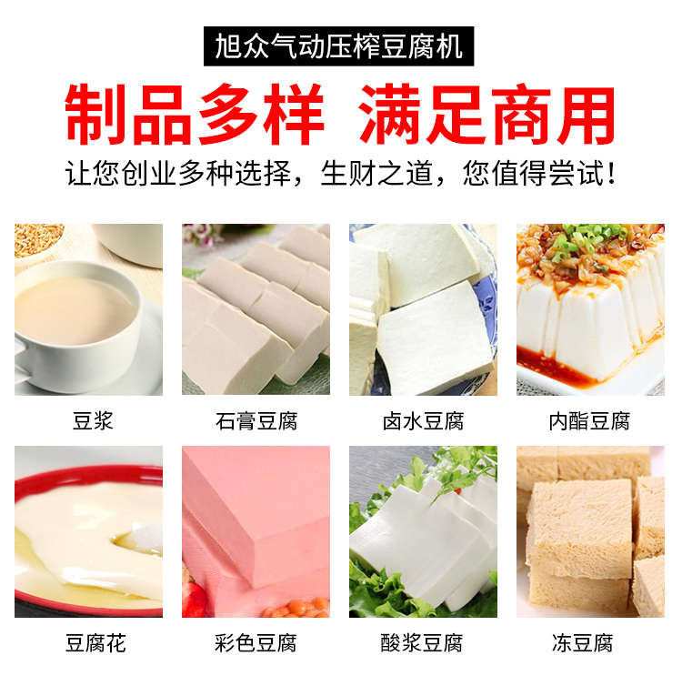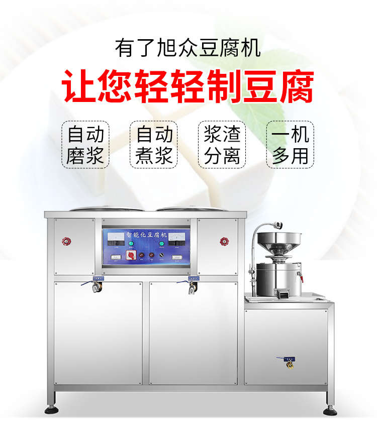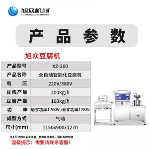 XZ-300型氣動壓榨豆腐機,智能豆腐豆?jié){機,雙桶煮漿高效生產(chǎn)現(xiàn)磨現(xiàn)煮,漿渣分離快速出漿。機器運行穩(wěn)定不銹鋼材質打造,堅固耐用,安全衛(wèi)生,時尚大方,易于清洗。
