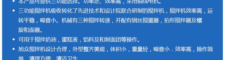 SZM-20型四功能攪拌機(jī),可用于攪拌奶油、蛋糕液、餡料及和制面團(tuán)等操作。打蛋攪拌機(jī)等作攪拌食料、揉和面團(tuán)之用,是生產(chǎn)優(yōu)質(zhì)糕點(diǎn)的理想設(shè)備,適用于酒店、飯店、學(xué)校部門、面包屋以及食品廠家。