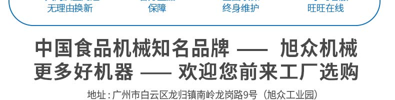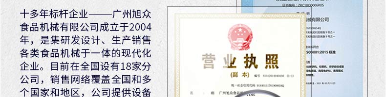 廣州旭眾食品機械有限公司是一家集科研開發(fā),生產(chǎn)設(shè)計,營銷服務(wù)為一體的現(xiàn)代化生產(chǎn)企業(yè)?,F(xiàn)代化生產(chǎn)車間,精湛制造技術(shù),所產(chǎn)機械歷經(jīng)市場重重考驗,不斷贏得海內(nèi)外客戶的贊譽。