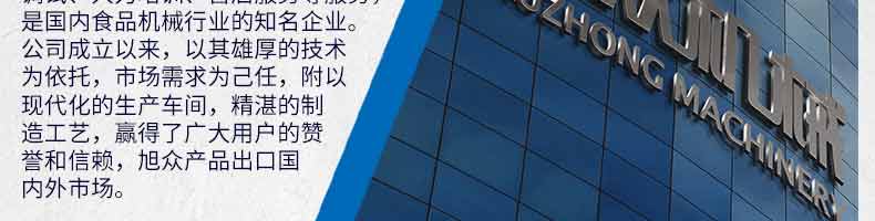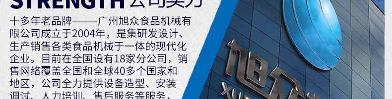 廣州旭眾食品機械有限公司是一家集科研開發(fā),生產(chǎn)設計,營銷服務為一體的現(xiàn)代化生產(chǎn)企業(yè)?,F(xiàn)代化生產(chǎn)車間,精湛制造技術,所產(chǎn)機械歷經(jīng)市場重重考驗,不斷贏得海內(nèi)外客戶的贊譽。