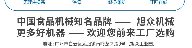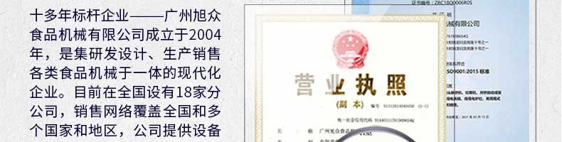 廣州旭眾食品機(jī)械有限公司是一家集科研開發(fā),生產(chǎn)設(shè)計(jì),營銷服務(wù)為一體的現(xiàn)代化生產(chǎn)企業(yè)。現(xiàn)代化生產(chǎn)車間,精湛制造技術(shù),所產(chǎn)機(jī)械歷經(jīng)市場重重考驗(yàn),不斷贏得海內(nèi)外客戶的贊譽(yù)。
