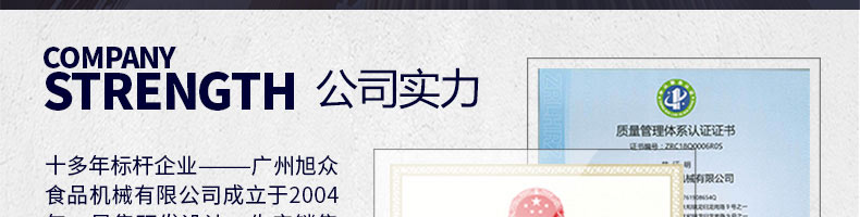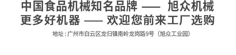 廣州旭眾食品機械有限公司是一家集科研開發(fā),生產(chǎn)設(shè)計,營銷服務(wù)為一體的現(xiàn)代化生產(chǎn)企業(yè)?,F(xiàn)代化生產(chǎn)車間,精湛制造技術(shù),所產(chǎn)機械歷經(jīng)市場重重考驗,不斷贏得海內(nèi)外客戶的贊譽。