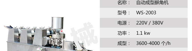 WS-2003 型自動(dòng)成型酥角機(jī)(油餃機(jī)),適用于制作酥角、油餃,可包的餡有:花生、椰蓉、白糖等。適合多種面粉材料、并且成型封口美觀牢固。小模約47mm,大模約57mm隨機(jī)標(biāo)配一套模具。購機(jī)贈(zèng)送工藝配方。