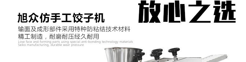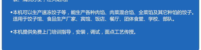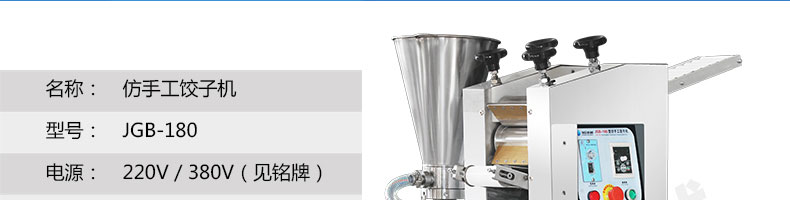 JGB-180餃子機(jī),先進(jìn)的自動(dòng)餃子生產(chǎn)設(shè)備,包括主動(dòng)壓皮部分、自動(dòng)供餡部分、自動(dòng)包合部分、自動(dòng)成品輸送部分,并且只要更換模具,就可制鍋貼等食品。適合食品速凍廠(chǎng)、飯店、廠(chǎng)礦學(xué)校食堂等制作包餡面制品單位使用。
