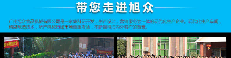 廣州旭眾食品機(jī)械有限公司是一家集科研開(kāi)發(fā),生產(chǎn)設(shè)計(jì),營(yíng)銷服務(wù)為一體的現(xiàn)代化生產(chǎn)企業(yè)?,F(xiàn)代化生產(chǎn)車間,精湛制造技術(shù),所產(chǎn)機(jī)械歷經(jīng)市場(chǎng)重重考驗(yàn),不斷贏得海內(nèi)外客戶的贊譽(yù)。