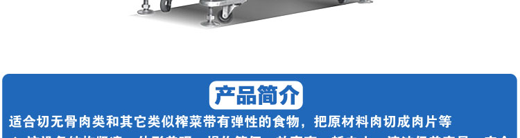 SA-350H 全自動(dòng)落地式切片機(jī),適合切無(wú)骨肉類(lèi)和其他類(lèi)似榨菜帶有彈性的食物,把原材料肉切成肉片,并可自動(dòng)成卷狀??汕信H馄?、羊肉片等