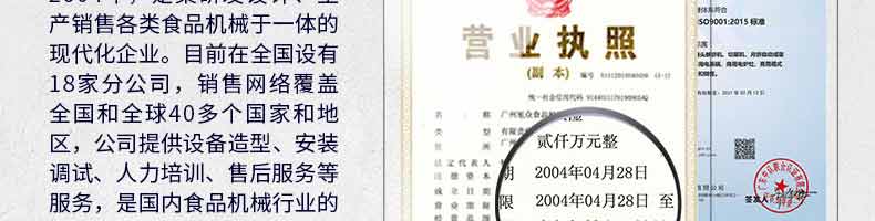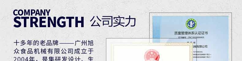 廣州旭眾食品機(jī)械有限公司是一家集科研開(kāi)發(fā),生產(chǎn)設(shè)計(jì),營(yíng)銷服務(wù)為一體的現(xiàn)代化生產(chǎn)企業(yè)?,F(xiàn)代化生產(chǎn)車間,精湛制造技術(shù),所產(chǎn)機(jī)械歷經(jīng)市場(chǎng)重重考驗(yàn),不斷贏得海內(nèi)外客戶的贊譽(yù)。