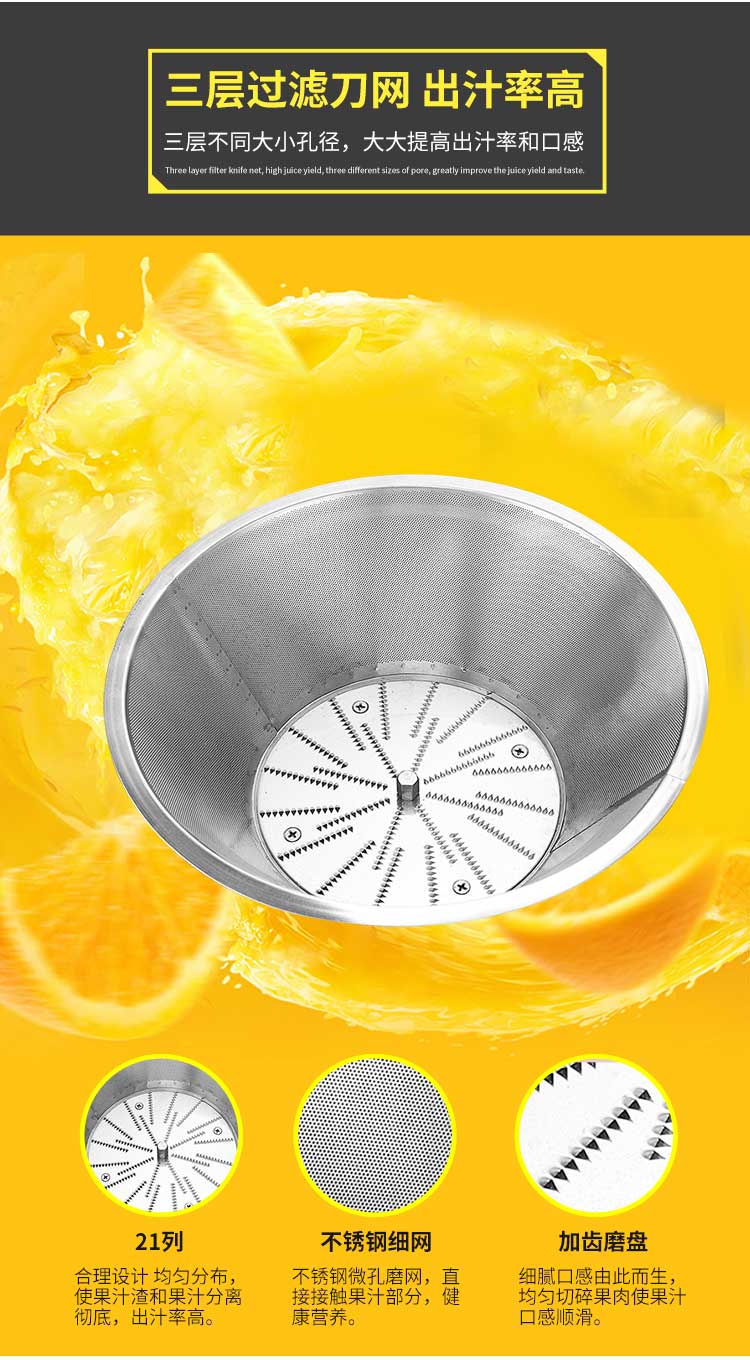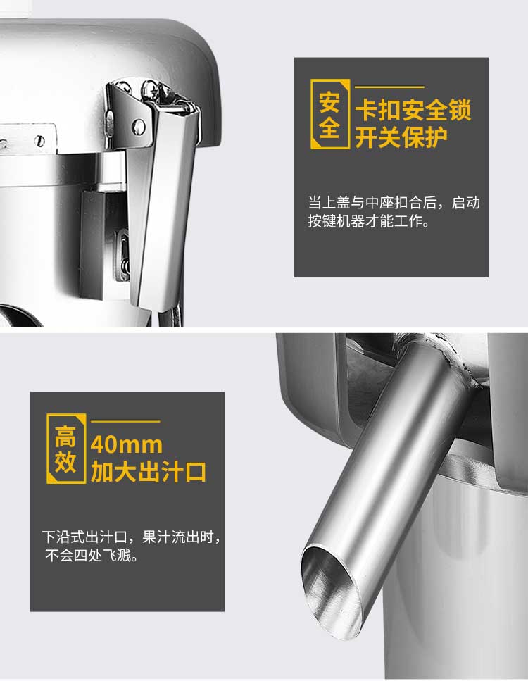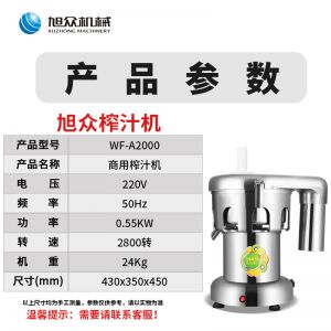 WF-A2000商用榨汁機(jī),該機(jī)所榨出的汁液是現(xiàn)榨的原汁,不含任何人為的防腐劑、穩(wěn)定劑、色素、香精、水等,凡與榨汁接觸的原件均為不銹鋼和無(wú)毒塑料聚丙烯和 A.B.S,食用安全。