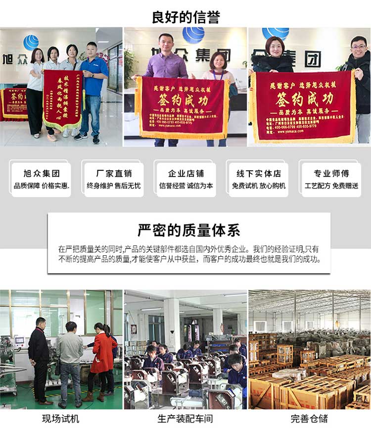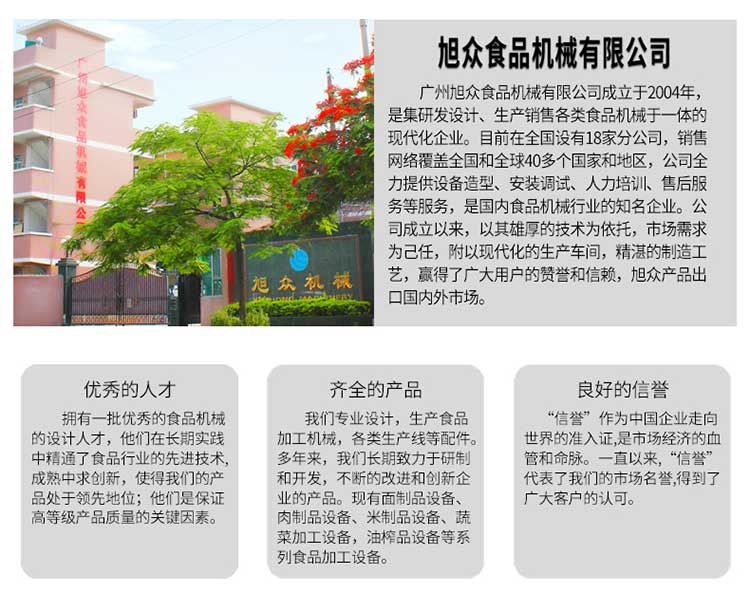 廣州旭眾食品機(jī)械有限公司是一家集科研開(kāi)發(fā),生產(chǎn)設(shè)計(jì),營(yíng)銷服務(wù)為一體的現(xiàn)代化生產(chǎn)企業(yè)。現(xiàn)代化生產(chǎn)車間,精湛制造技術(shù),所產(chǎn)機(jī)械歷經(jīng)市場(chǎng)重重考驗(yàn),不斷贏得海內(nèi)外客戶的贊譽(yù)。