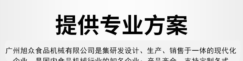 廣州旭眾食品機(jī)械有限公司是一家集科研開發(fā),生產(chǎn)設(shè)計,營銷服務(wù)為一體的現(xiàn)代化生產(chǎn)企業(yè)。現(xiàn)代化生產(chǎn)車間,精湛制造技術(shù),所產(chǎn)機(jī)械歷經(jīng)市場重重考驗,不斷贏得海內(nèi)外客戶的贊譽(yù)。
