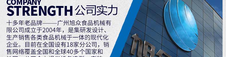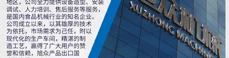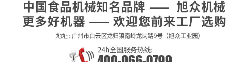 廣州旭眾食品機械有限公司是一家集科研開發(fā),生產設計,營銷服務為一體的現代化生產企業(yè)?,F代化生產車間,精湛制造技術,所產機械歷經市場重重考驗,不斷贏得海內外客戶的贊譽。