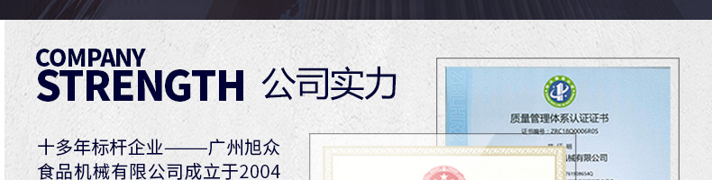 廣州旭眾食品機械有限公司是一家集科研開發(fā),生產(chǎn)設(shè)計,營銷服務(wù)為一體的現(xiàn)代化生產(chǎn)企業(yè)?,F(xiàn)代化生產(chǎn)車間,精湛制造技術(shù),所產(chǎn)機械歷經(jīng)市場重重考驗,不斷贏得海內(nèi)外客戶的贊譽。