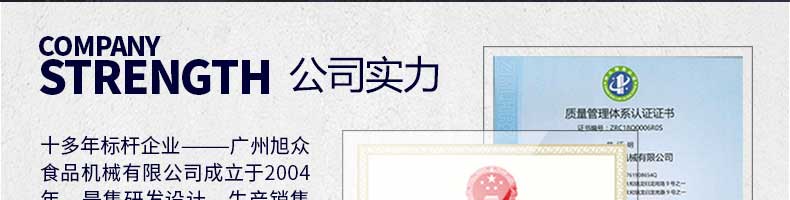 廣州旭眾食品機械有限公司是一家集科研開發(fā),生產(chǎn)設計,營銷服務為一體的現(xiàn)代化生產(chǎn)企業(yè)?,F(xiàn)代化生產(chǎn)車間,精湛制造技術,所產(chǎn)機械歷經(jīng)市場重重考驗,不斷贏得海內外客戶的贊譽。